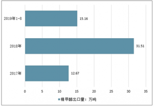2017-2019年8月精甲醇出口量(單位:萬(wàn)噸)