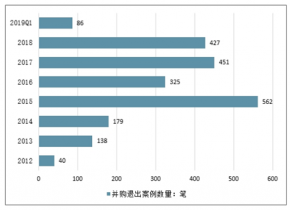 2012-2019年Q1中國市場(chǎng)股權(quán)投資項(xiàng)目并購?fù)顺鰯?shù)量變化趨勢(shì)(按并購?fù)顺霭咐龜?shù)量,筆)