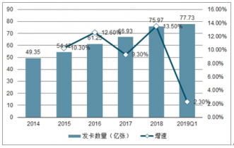 2014-2019Q1中國(guó)銀行卡在用發(fā)卡量及增速趨勢(shì)