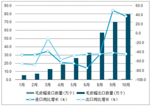 2019年1-10月中國(guó)毛皮帽累計(jì)進(jìn)出口數(shù)量及增速趨勢(shì)圖