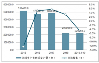 2015-2019年1-10月中國飼料生產專用設備產量及增速趨勢圖