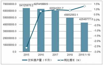 2015-2019年1-10月中國飲料酒產(chǎn)量及增速趨勢(shì)圖