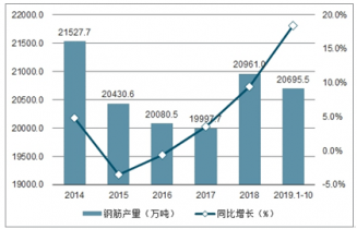 10月中國鋼筋產量為2206.7萬噸,同比增長11.9%;2019年1-10月中國鋼筋產量為20695.5萬噸,同比增長18.4%。