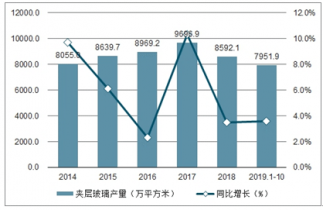 10月中國夾層玻璃產(chǎn)量為836.6萬平方米,同比增長0.6%;2019年1-10月中國夾層玻璃產(chǎn)量為7951.9萬平方米,同比增長3.6%。