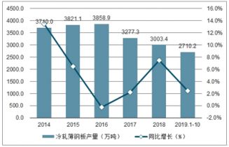 10月中國冷軋薄鋼板產量為275.8萬噸,同比增長0.3%;2019年1-10月中國冷軋薄鋼板產量為2710.2萬噸,同比增長2.5%。