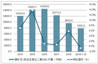 2019年1-10月中國磷礦石(折含五氧化二磷30%)產量及增速統計表