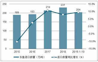 2015-2019年1-10月中國凍魚進口數量及增速趨勢圖