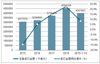 2015-2019年1-10月中國凍魚金額及增速趨勢圖