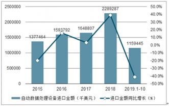 2015-2019年1-10月中國(guó)自動(dòng)數(shù)據(jù)處理設(shè)備進(jìn)口金額及增速趨勢(shì)圖