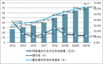 2018年中國網絡婚戀交友行業市場營收為49.9億元,網絡婚戀行業在整體婚戀市場中滲透率為54.4%,預計到2021年網絡婚戀市場將保持穩定增長總營收超70億,滲透率將進一步提升。經過一輪資本助推后,現階段網絡婚戀行業營收恢復高速增長,其中核心企業百合佳緣集團雙品牌運作成果顯著,而珍愛網的快速增長也對行業起到一定促進作用,網絡婚戀核心企業正持續借助品牌影響力,通過產業互聯網路徑,持續向婚慶、婚姻咨詢、金融等業務拓展,未來隨著網絡婚戀核心企業的不斷深耕,行業將保持穩定增長。