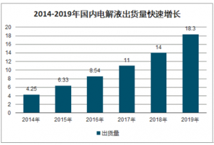 我國電解液出貨量由2014年的4.25萬噸快速增長至2019年的18.3萬噸,CAGR高達33.91%。