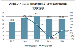 2019年上半年,國內紡織服裝行業景氣度有所上升,服裝銷售市場有所回暖,一定程度上刺激了紡織服裝檢測市場。2019年中國紡織服裝檢驗檢測行業營收規模在53.06億元左右,同比下降0.3%。