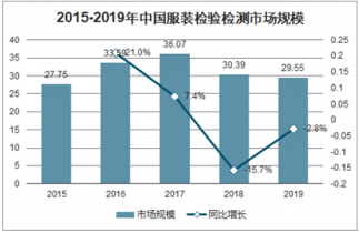 2018年,中國服裝檢驗檢測市場規模為30.39億元,同比下降15.7%;2019年,中國服裝檢驗檢測市場規模為29.55億元左右,同比下降2.8%。