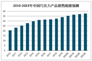 巧克力進入中國市場已有60多年,但整體而言我國巧克力產品市場規模仍較小。2019年我國巧克力產品銷售規模為34.10億美元,同比2018年增長4.76%,預計2020年全年銷售額可達35.37億美元,到2023年全球銷售額達37.65億美元。