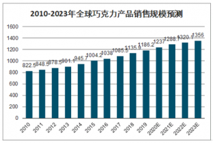 2010年以來,全球巧克力產品銷售規模穩步增長, 2019年全球巧克力產品銷售規模達1186.2億美元,同比2018年增長4.4%,預計2020年全年銷售額可達1237.0億美元,到2023年全球銷售額將超過1350億美元。