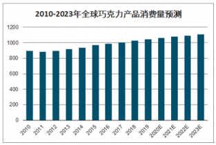 2019年全球巧克力產品消費量達1042.4萬噸,同比2018年增長1.8%,預計2020年全年消費量可達1060.1萬噸,到2023年全球消費量將超過1100萬噸。