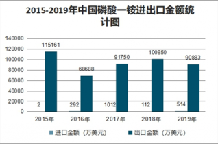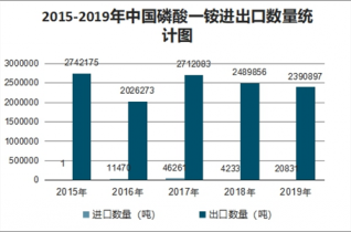 2019年1-12月中國磷酸一銨進口數量為20831噸,進口金額為514萬美元;2019年1-12月中國磷酸一銨出口數量為2390897噸,出口金額為90883萬美元。