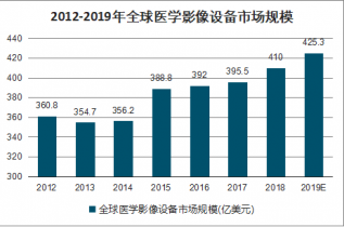 2012年以來,全球醫(yī)學(xué)影像設(shè)備市場(chǎng)規(guī)模增長(zhǎng)較為緩慢,走勢(shì)平穩(wěn);2017年,全球醫(yī)學(xué)影像設(shè)備市場(chǎng)規(guī)模達(dá)到395.45億美元;預(yù)計(jì)2019年,全球醫(yī)學(xué)影像設(shè)備市場(chǎng)規(guī)模將達(dá)到425.25億美元。