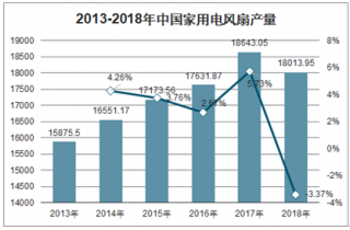 2013-2017年中國(guó)家用電風(fēng)扇產(chǎn)量逐年上升,2017年中國(guó)家用電風(fēng)扇產(chǎn)量達(dá)到18643.05萬臺(tái),同比增長(zhǎng)5.73%;2018年中國(guó)家用電風(fēng)扇產(chǎn)量為18013.95萬臺(tái),同比下降3.37%。