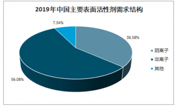 表面活性劑可分為陽離子表面活性劑、陰離子表面活性劑、非離子表面活性劑和兩性離子表面活性劑,從產品結構來看,陰離子表面活性劑、非離子表面活性劑需求比重最高,分別占比56.08%、36.58%。