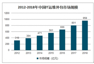 2012年中國IT運維外包市場規模已達313億元。2015年中國IT運維外包市場規模達到561億元。到了2016年中國IT運維外包市場規模達到了666億元,截止至2017年中國IT運維外包市場規模增長超800億元。2012-2017年復合增長率高達20.3%。到了2018年底中國IT運維外包市場規模達到了958億元,同比增加19.5%。