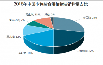 我國食用植物油按包裝方式可分為散裝油、中包裝食用油及小包裝食用油,其中小包裝食用植物油按細分油種又可以分為大豆油、調和油、菜籽油、玉米油、葵花籽油、花生油等品類。從消費結構上看,大豆油、調和油及菜籽油是我國小包裝食用植物油中銷售量最大的三個品類,2018年銷售量市場份額分別占比28%、22%和18%。
