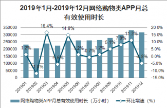 2019年1月-2019年12月網絡購物類APP月總有效使用時長