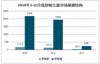 2019年1-11月我國吸塵器市場零售額為177.5億元,同比增長2.5%,零售量為2189萬臺,同比增長7.7%;線上渠道零售額為137.6億元,同比增長3.3%,零售量為1949萬臺,同比增長7.8%;線下渠道零售額為39.9億元,同比下降0.2%,零售量為240萬臺,同比增長7.2%。