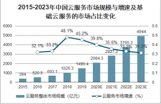 2015-2023年中國云服務市場規模與增速及基礎云服務的市場占比變化