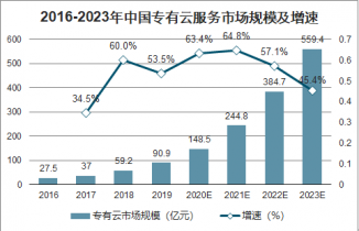 專有云市場體量雖然遠小于已經高速發展多年的公有云市場,但各級政府相繼出臺推動企業“上云”的各項促進政策,政務云、金融云等行業云市場相對活躍,他們對安全性和可控性是選擇云服務最重要的因素,因此推動了對專有云的需求,近兩年專有云市場開始明顯加速,迎來高速發展期。中企顧問網發布的《2022-2028年中國云計算行業市場分析預測及戰略咨詢研究報告》數據顯示:2018年,中國專有云市場規模達59.2億元,預計在2018-2023年的五年復合增長率為56.7%,至2023年市場規模將達到559.4億元。但從目前規模來看,專有云市場整體上還處在比較初級的階段。