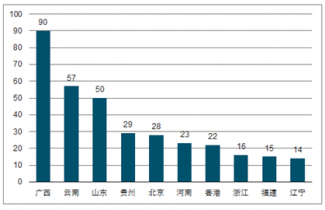 2018年,全國自然巖場共有432個,主要集中在11個省份,這11個省份占據了八成巖場。其中,廣西自然巖場數量最多,約為90個,占比20.8%;云南、山東緊隨其后,自然巖場均超過50個。