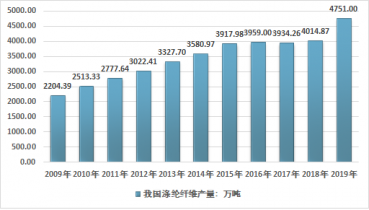 2009-2019年全國滌綸纖維產(chǎn)量走勢圖 |