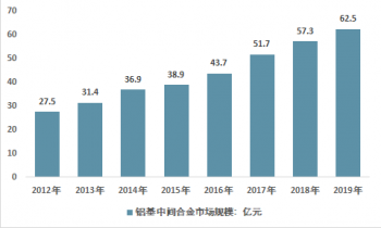 近幾年,我國鋁基中間合金行業市場規模快速增長,從2012年的27.5億元增長到了2019年的62.5億元。近幾年我國鋁基中間合金行業市場規模情況如下圖所示: