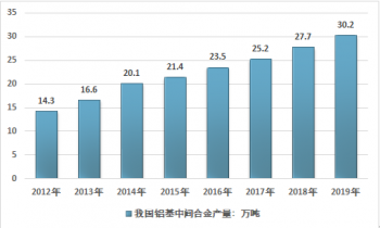目前我國生產鋁基中間合金的廠家已經超過百家,規模較大的企業生產能力萬噸以上,小型企業的生產能力則在幾百噸。2012年我國鋁基中間合金產量為14.3萬噸,2019年國內產量30.2萬噸,2012年以來我國鋁基中間合金產量年復合增長率為9.80%。