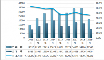 我國是全球主要的乙酰甲胺磷生產(chǎn)國之一,2019年我國乙酰甲胺磷出口量為9900噸,出口量占國內(nèi)產(chǎn)量比重的46.0%。