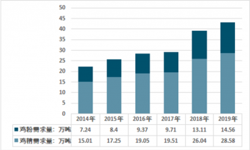 數(shù)據(jù)顯示,2019年我國(guó)雞精(雞粉)行業(yè)需求量約43.14萬噸,雞精(雞粉)行業(yè)市場(chǎng)規(guī)模達(dá)到了44.95億元。
