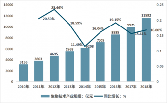 2010-2018年中國(guó)生物技術(shù)產(chǎn)業(yè)規(guī)模及增速情況