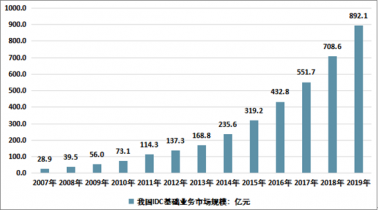 近年來,隨著互聯(lián)網(wǎng)業(yè)務(wù)的高速發(fā)展,IDC市場(chǎng)正進(jìn)入快速增長(zhǎng)期。據(jù)統(tǒng)計(jì),2005~2012年,中國(guó)IDC市場(chǎng)規(guī)模增長(zhǎng)了6倍,年均增長(zhǎng)率超過30%。2012年中國(guó)IDC基礎(chǔ)業(yè)務(wù)規(guī)模達(dá)到137.2億元,同比增長(zhǎng)20%,2014年產(chǎn)業(yè)規(guī)模增長(zhǎng)至235.6億元,較2013年同期增長(zhǎng)39.6%,到2019年產(chǎn)業(yè)規(guī)模增長(zhǎng)到892.1億元,近年來產(chǎn)業(yè)規(guī)模延續(xù)高速增長(zhǎng)態(tài)勢(shì)。