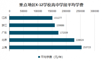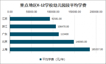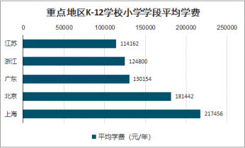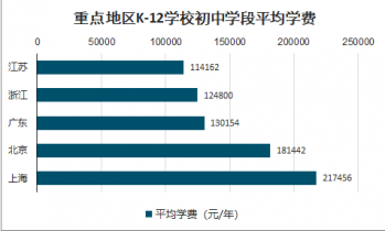 北京K-12國際學校平均學費近19萬元/年,位居全國第二。廣東、浙江、江蘇三地K-12國際學校平均學費均在13至14萬元/年,處于全國第二梯隊。江蘇地區K-12國際學校初中學段平均學費已達19萬元/年,逼近上海、北京同學段學費。
