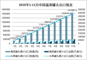 2019年1-11月蔬菜罐頭進(jìn)口數(shù)量為10466.8噸,同比下降15.1%;出口數(shù)量為1453881.8噸,同比增長6.5%。2019年1-11月蔬菜罐頭進(jìn)口金額為1039.4萬美元,同比下降4.6%;出口金額為200708.4萬美元,同比增長16.5%。