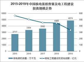 2015-2019年中國核電裝機容量及電工程建設投資規(guī)模走勢