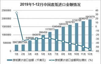 2019年1-12月中國廢紙進口金額為1943079千美元,同比下降54.8%。