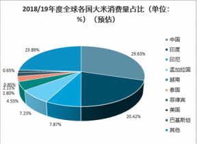 從大米消費量來看,中國和印度依然排名全球第一、第二名。中國和印度是世界第一、第二的人口大國,大米消費量較大。2018/19年度,中國大米消費量占全球大米消費量的29.63%,接近30%,印度則占20.42%的比重。