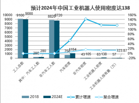 預計2024年中國工業機器人密度達到138,非汽車行業達到105,汽車行業達到1154。