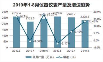 2019年1-8月儀器儀表產量不斷增加,2019年6月產量2436.3萬臺,同比增加18.2%,2019年1-8月累計產量19220.2萬臺,累計增長3%。