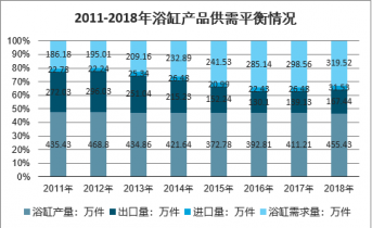 隨著我國經濟增長,及由此帶來的居民衛浴產品消費升級,我國浴缸產品需求不斷增長,特別是高端浴缸需求將會持續增長。數據顯示,2018年我國浴缸產品產量約455.43萬件,行業進口量約31.53萬件,出口約167.44萬件,國內浴缸產品需求量約319.52萬件。