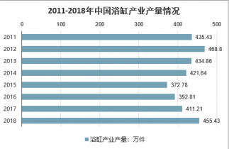 2018年我國浴缸產業產量約455.43萬件,同比2017年的411.21萬件增長了10.75%。
