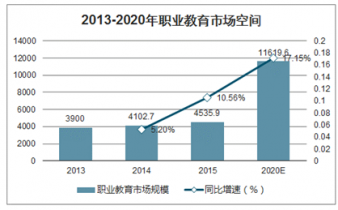 職業(yè)教育市場空間龐大,劍指萬億市場。職業(yè)教育市場規(guī)模是學歷教育和非學歷教育市場規(guī)模之和。2015年我國職業(yè)教育市場空間為4536億元,預計2020年將達到11620億元,五年復合增速達17.15%。其中,學歷職業(yè)教育市場規(guī)模為1430億元,預計2020年將達到1761億元,五年復合增速為4.25%;非學歷職業(yè)教育市場規(guī)模為3106億元,預計2020年將達到9859億元,五年復合增速達25.99%。