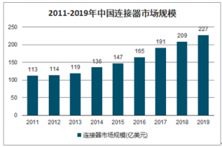 近年來,中國經濟保持持續快速增長,在中國經濟高速發展的帶動下,通信、交通、電腦、消費電子等連接器下游市場也取得了快速增長,直接帶動我國連接器市場需求急劇增長,2011年到2019年,中國連接器市場規模由113億美元增長到227億美元。