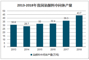 染料中間體泛指用于生產染料和有機顏料的各種芳烴衍生物。它們是以來自煤化工和石油化工的苯、甲苯、萘和蒽等芳香烴為基本原料,通過一系列有機合成單元過程而制得。全球染料及染料中間體的來源國主要為中國、印度、德國和瑞士。自上世紀80年代以來,由于歐美市場紡織制造業逐漸向亞洲轉移,以及我國加入世貿組織的影響極大程度地促進了國內市場上染料行業以及染料中間體行業的發展,我國目前染料中間體產量居世界首位。2018年我國染顏料中間體的產量為43.7萬噸,較2017年增長7.4萬噸,增幅為20.39%。2013年至2018年我國染顏料中間體產量從30.8萬噸增長至43.7萬噸,年化復合增長率為7.25%。